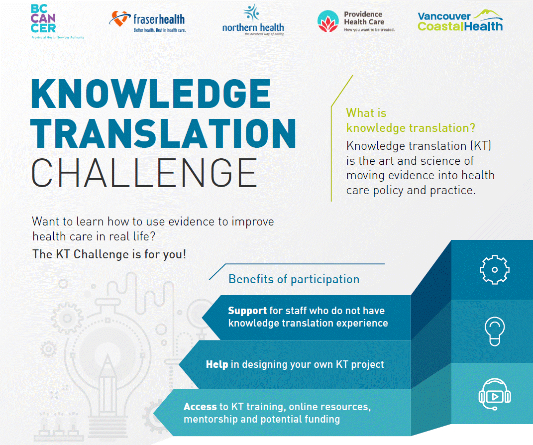 BC Cancer is delighted to partner with Providence Health Care, Vancouver Coastal Health, Fraser Health, and Northern Health on the Knowledge Translation Challenge program.